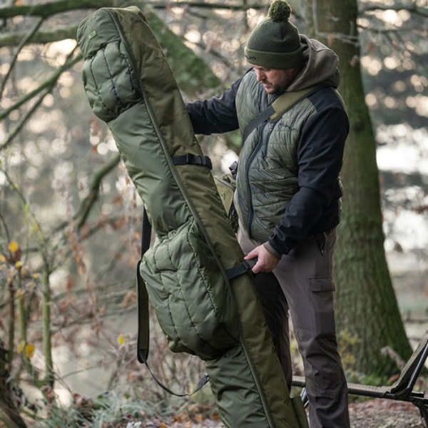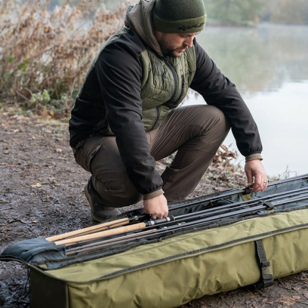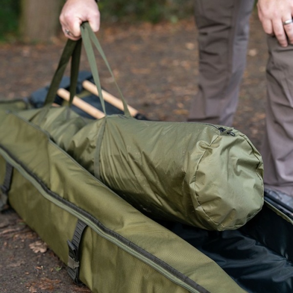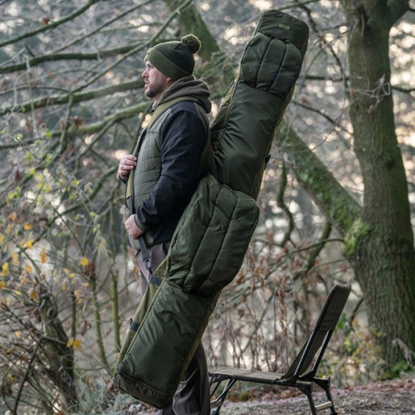 Este modelo incorpora un compartimento articulado para las cañas de 12ft que se separa del compartimento trasero destinado a refugios y brollies. Esta estructura proporciona los beneficios de un carcaj tradicional, pero con una protección superior para las cañas y carretes. La zona principal está ampliamente acolchada, permitiendo alojar cómodamente tres cañas montadas.