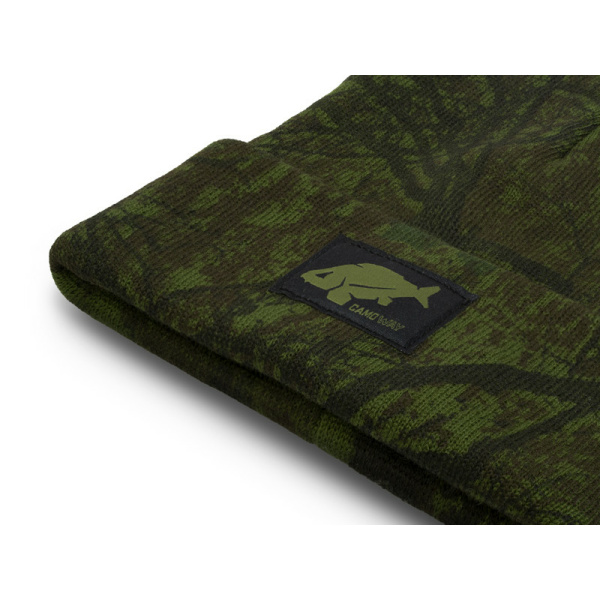 Un elegante gorro de la marca delphin, modelo outline camoway de camuflaje con un sutil tema de árboles otoñales que presenta nuestro diseño original de carpa, OutLINE.