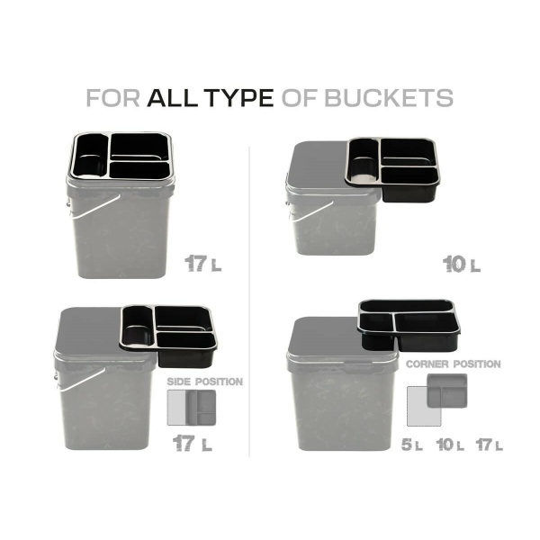 Una de sus mayores ventajas es que puede colocarse directamente en el borde del cubo, permitiendo trabajar simultáneamente con el contenido del cubo y del propio inserto. Esto resulta especialmente útil al preparar mezclas, separar cebos o mantener a mano los accesorios esenciales junto a las cañas.